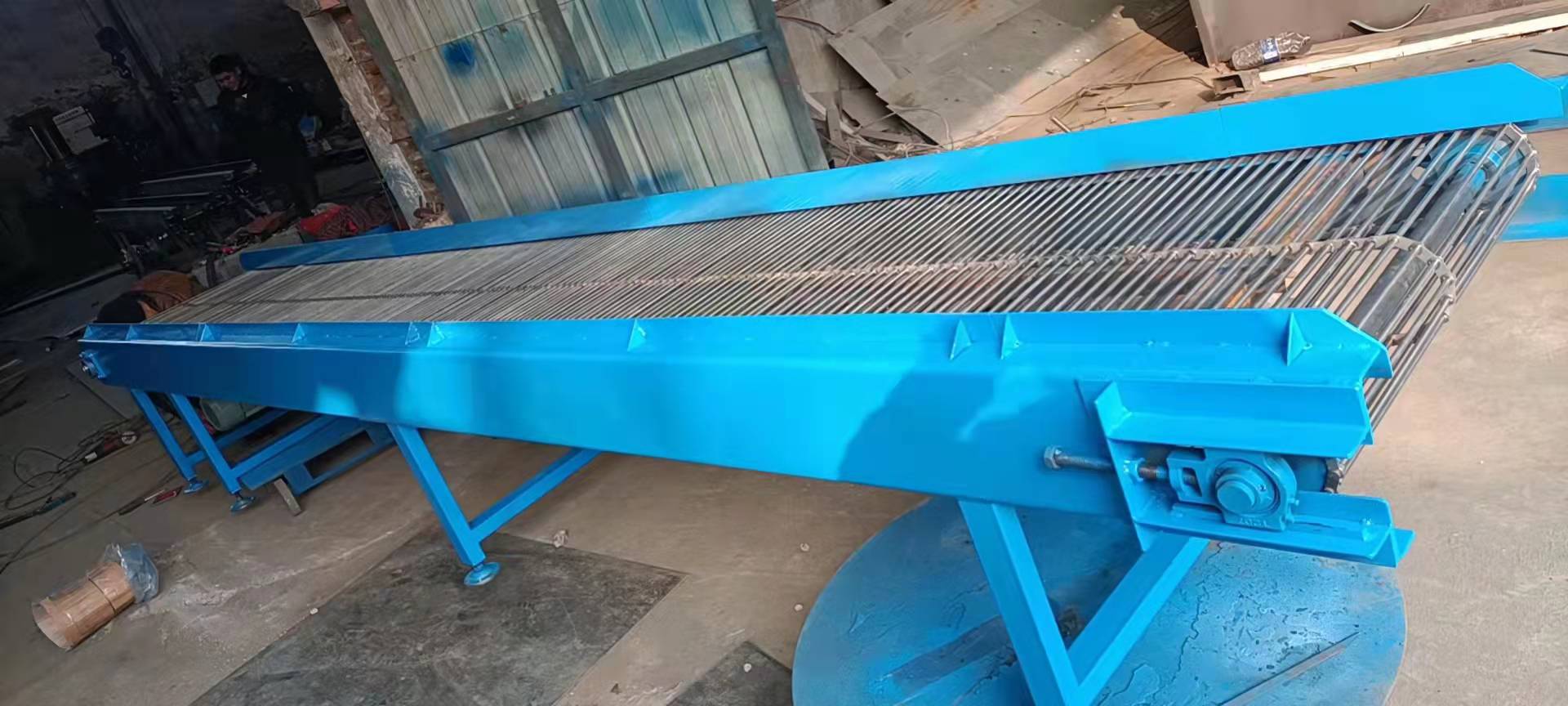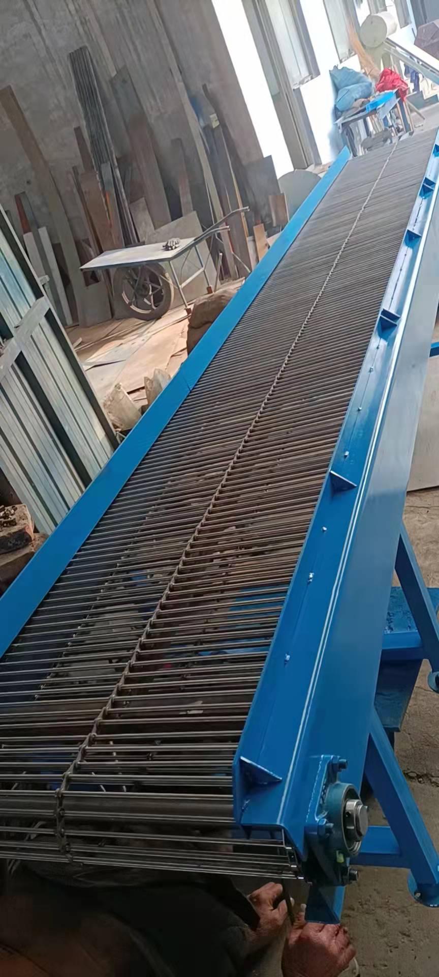 給淄博 山東超越輕工制品有限公司定做的玻璃瓶降溫傳送帶輸送機完工今天發(fā)貨 鏈桿片輸送機 長度5米 有效寬度720毫米 高度800毫米 從地面到鏈桿輸送帶上平面是800毫米 可調節(jié)的高度再700-800毫米之間 實際調節(jié)距離100毫米 節(jié)距25.4毫米 支軸直徑8毫米 在輸送帶中間加一趟鏈條片