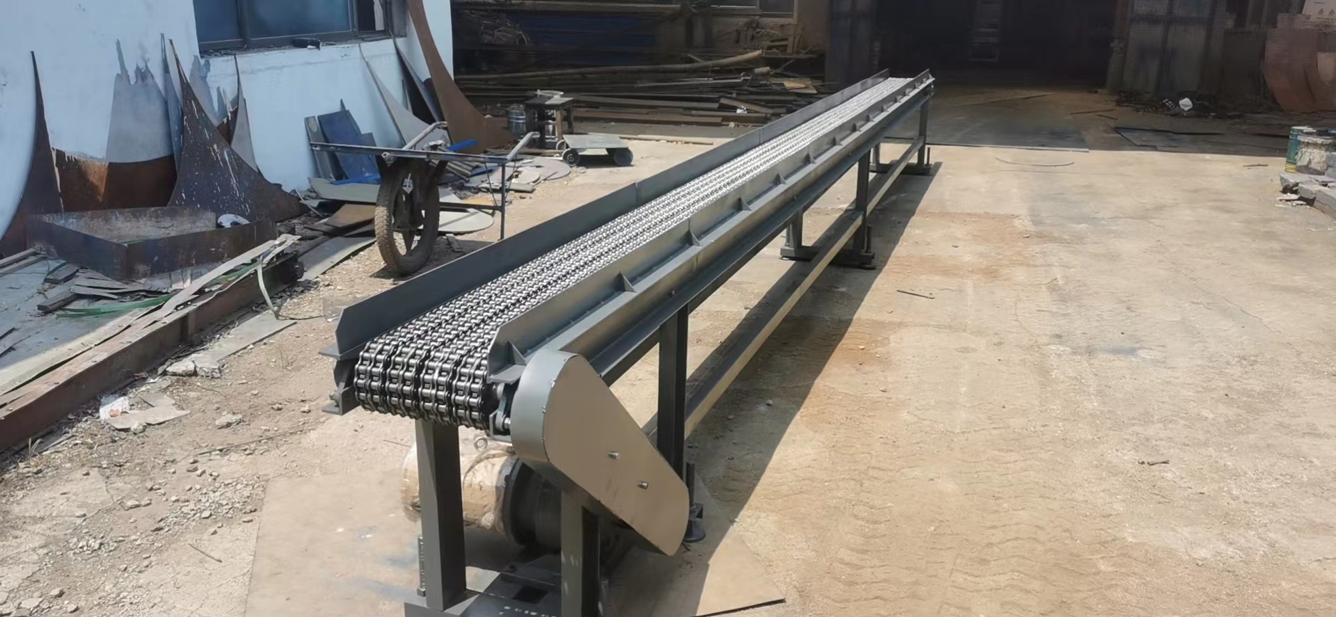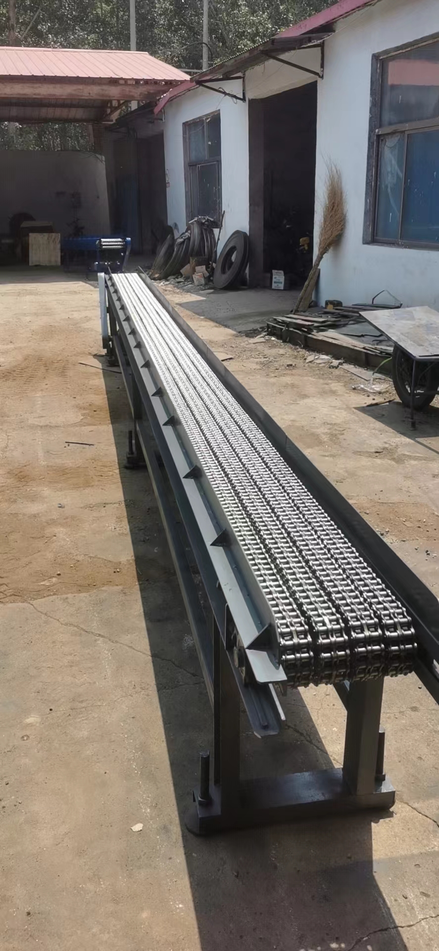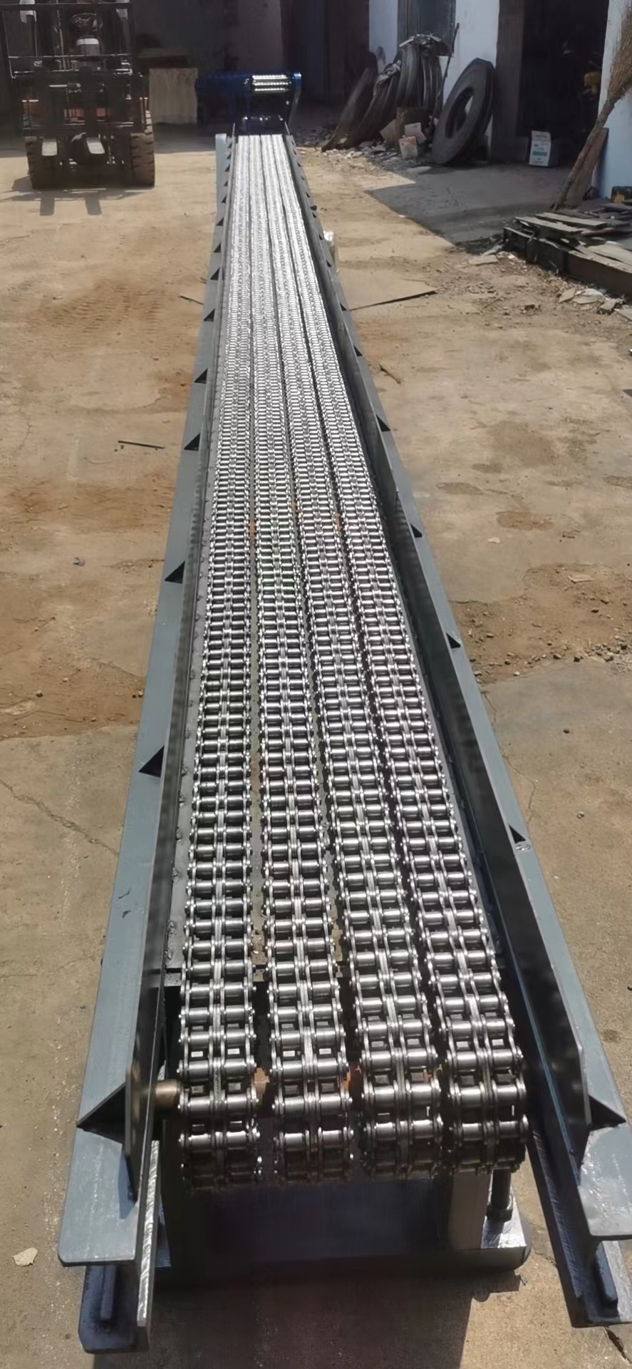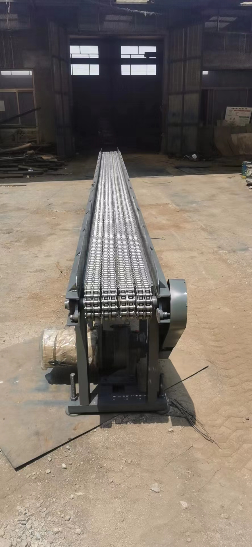 給煙臺(tái)鋼研海洋裝備材料應(yīng)用技術(shù)有限公司做的鏈條輸送機(jī)傳送帶完工發(fā)貨 長(zhǎng)度7.2米 有效寬度300毫米