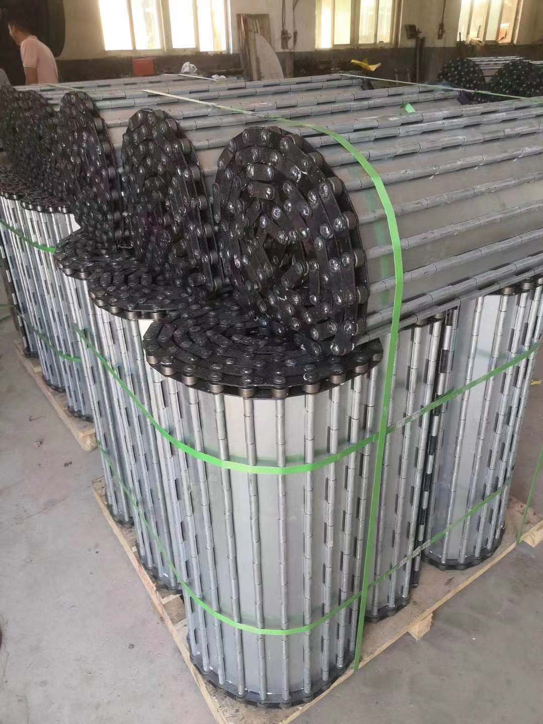 鏈板輸送帶全部是不銹鋼304材質(zhì) 鏈條節(jié)距101.6毫米 鏈條片厚度6毫米 滾子直徑57.15毫米 內(nèi)節(jié)內(nèi)寬31.75毫米 側(cè)擋板有效高度60毫米 板厚3毫米 板厚2毫米下差1.88-1.95毫米 沖孔8毫米 支軸直徑14毫米 兩頭不車 墊圈焊死。