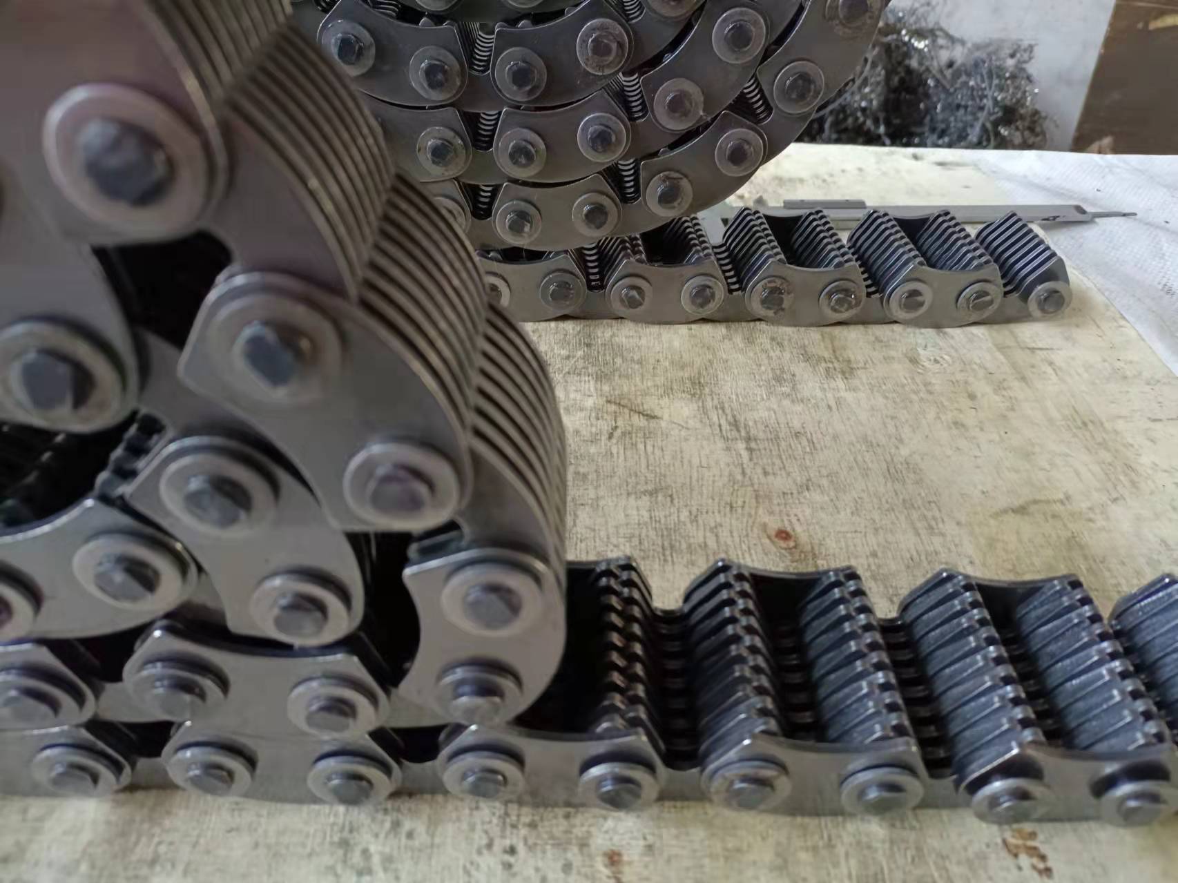 輸送機(jī)齒形鏈條經(jīng)常是使用平背鏈片,以此形成一個(gè)平滑的輸送表面,鏈條有抗污染的鉸鏈設(shè)計(jì),輸送機(jī)齒形鏈條頻繁應(yīng)用在輸送熱玻璃器皿和其他需要輸送機(jī)下方送風(fēng)以及要求傳送格外平穩(wěn)的工況。