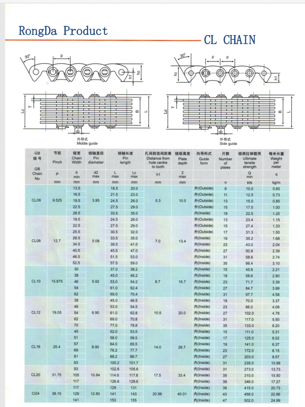齒形鏈條優(yōu)點主要特點:1.噪音小 齒形鏈是通過工作鏈板與鏈輪齒的漸開線齒形進行嚙合傳遞動力,與滾子鏈和套筒鏈相比其多邊形效應明顯降低,沖擊小、運動平穩(wěn)、嚙合噪音較小。2.可靠性較高 齒形鏈的鏈節(jié)是多片式結(jié)構(gòu),當其中個別鏈片在工作中遭到破壞時并不影響整根鏈條的工作,使人們能夠及時發(fā)現(xiàn)并更換,如需增加承載能力只需在寬度方向較小尺寸(增加鏈片排數(shù))。3.運動精度高 齒形鏈各鏈節(jié)磨損伸長均勻,可保持較高的運動精度。齒形鏈條主要應用范圍:齒形鏈主要應用在紡織機械和無心磨床,傳送帶機械設備。齒形鏈條的種類:CL06,CL08CL10,CL12,CL16CL20。根據(jù)導向分:內(nèi)導的齒形鏈條和外導的齒形鏈條,內(nèi)外復合的齒形鏈條