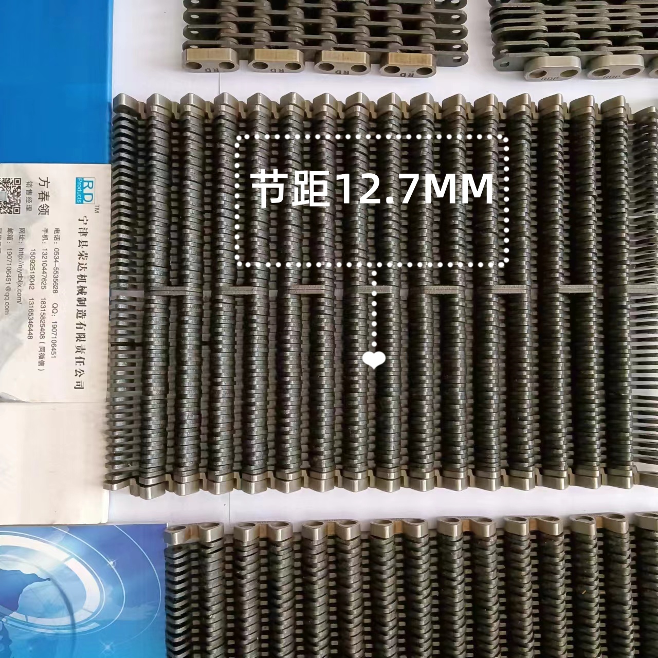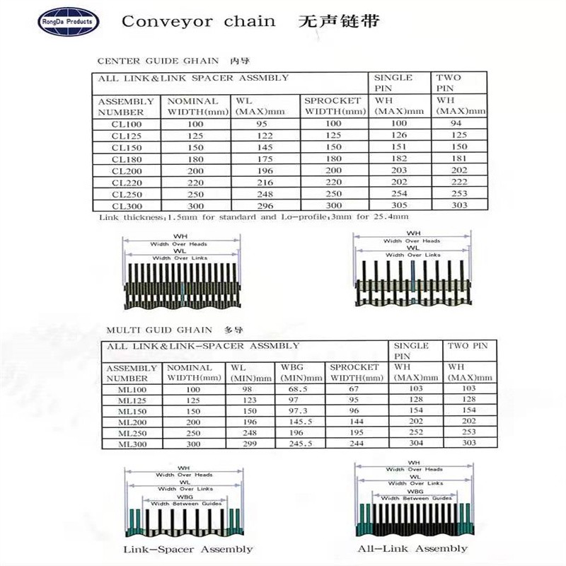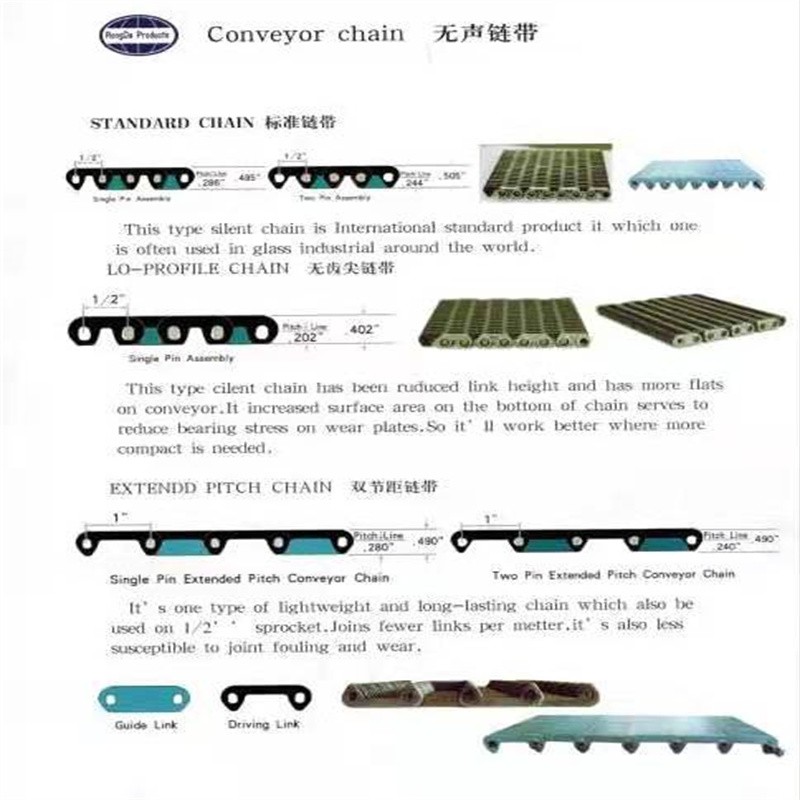 無聲齒形鏈帶:采用鏈條片和銷軸于墊圈做成的輸送用傳送帶,外形寬度非標(biāo)定做也有好多規(guī)格的現(xiàn)貨,鏈帶是用在玻璃廠輸送玻璃瓶罐器皿日用玻璃器皿的,也有的時候用在其他的輸送機(jī)械上,用來輸送其他產(chǎn)品,優(yōu)點(diǎn)就是平整,輸送面平穩(wěn),輸送高腳杯,不會倒瓶,用來輸送高溫玻璃制品,用于玻璃機(jī)械行列式制瓶機(jī)上,橫向輸瓶機(jī),我們還研發(fā)了轉(zhuǎn)彎的拐彎的無聲齒形鏈帶,用于縱向拐彎橫向結(jié)合的輸送機(jī)上。無聲齒形鏈帶材質(zhì)有碳鋼的 錳鋼的 合金鋼的 ,節(jié)距有12.7毫米 25.4毫米 單軸的和雙軸的,無齒形鏈帶從外形看有內(nèi)導(dǎo)向和外導(dǎo)向,有帶保護(hù)帽的和不帶保護(hù)帽的,無聲齒形鏈帶有帶尖的和不帶尖的.